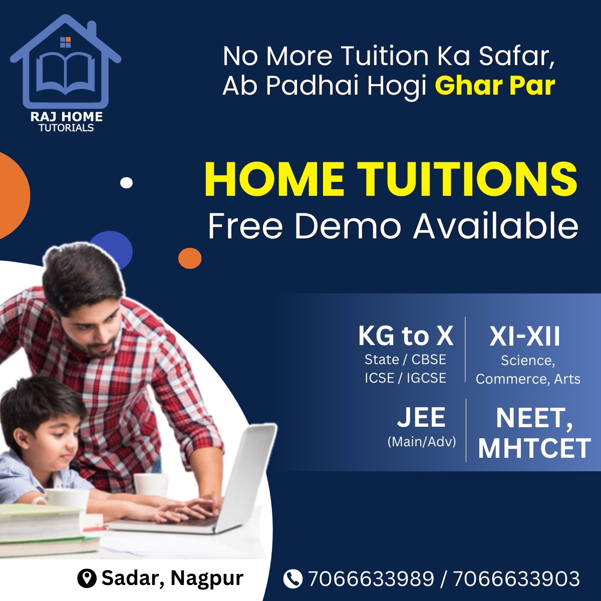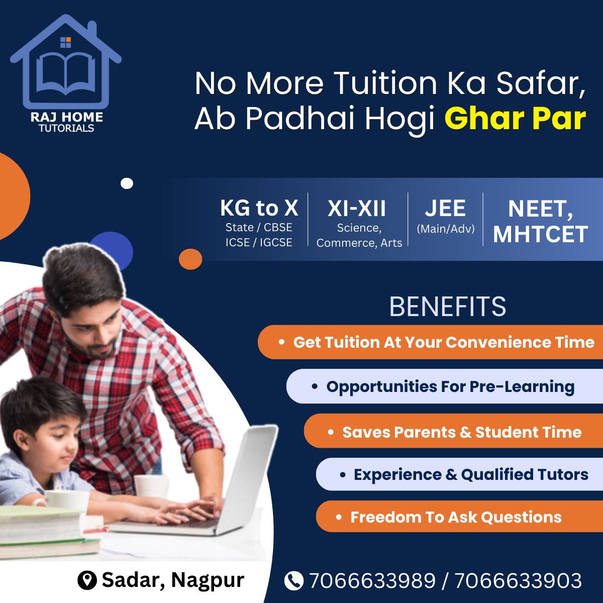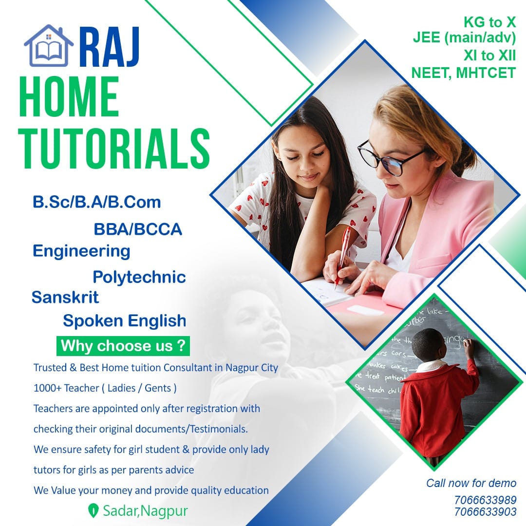 This Facility is available in almost all areas of Nagpur. More than 2500 Ladies/Gents Teachers are registered in Raj HOME TUTORIALS. WE PROVIDE ONLINE TUITION ALL OVER INDIA FOR ALL CLASSES. Further Details can be had from Raj HOME TUTORIALS with contact no. 7066633989.