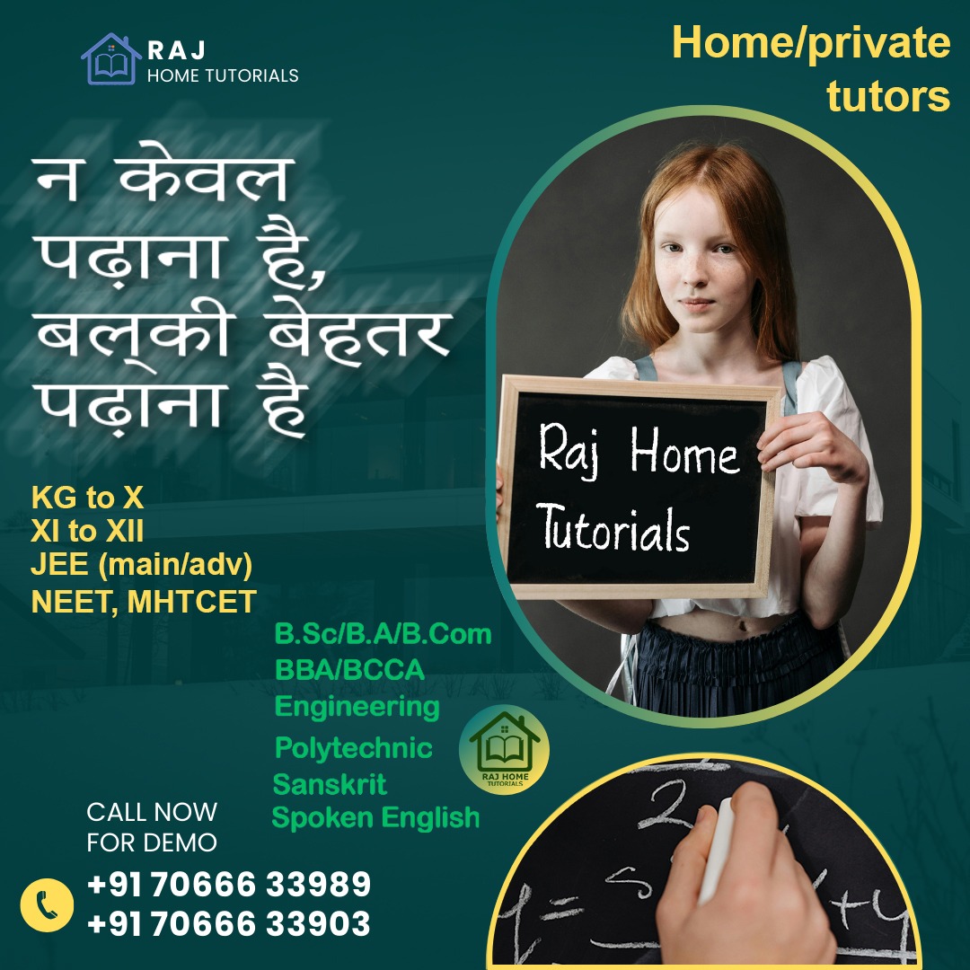 Raj Home Tutorials is an Institute Provides well Experienced and result oriented teachers (Home tutors) to teach students at Students Residence. Tutors are Available for KG to X, XI-XII, All Boards, JEE, NEET, MHTCET, Engineering, Polytechnic, B.sc, B.com, BA, BBA, BCA, BCCA, MBA, CA, BANKING, All Classes All Subjects.